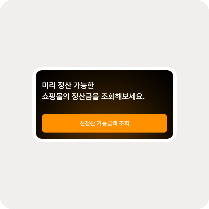 온라인 선정산 / MD서비스(선정산대행형) : 운영 자동화에 실시간 현금 흐름 확보(선정산)가 필요한 브랜드에 추천하며, 별도의 이자 비용 없이 이용 가능합니다.